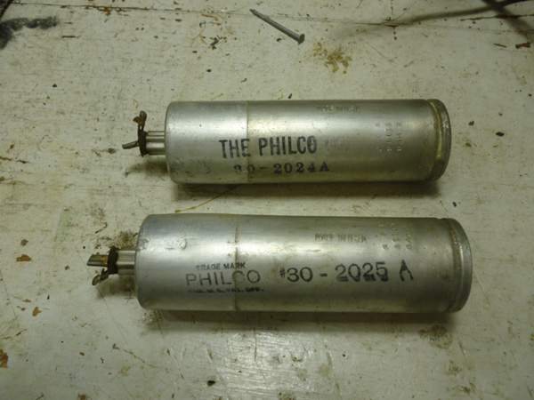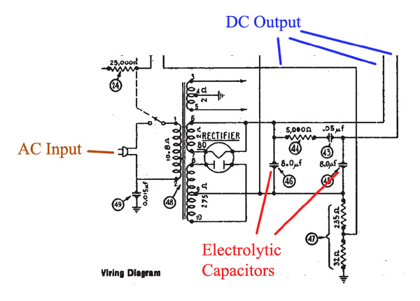 The above schematic shows the location of the electrolytic capacitors in a Philco Model 60. If the electroylytics capacitors