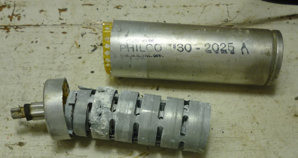 Below is a typical vintage electrolytic capacitor mounted on a chassis.